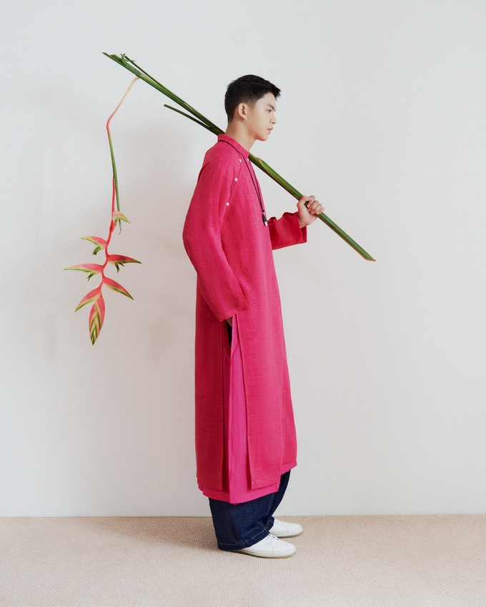 Traditional áo dài distilled into a contemporary silhouette, glowing in a vivid firecracker pink.